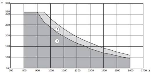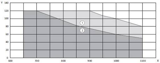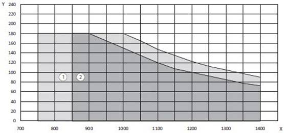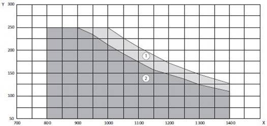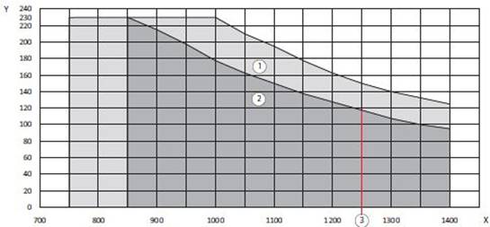 X = VÝŠKA KRÍDLA / Y = VÁHA KRÍDLA / 1 = RAMIENKO / 2 = KĹZNA LIŠTA / 3 = LIMIT PRE POUŽITIE KĹZNEJ LIŠTY PRI POŽIARNEJ OCHRANE